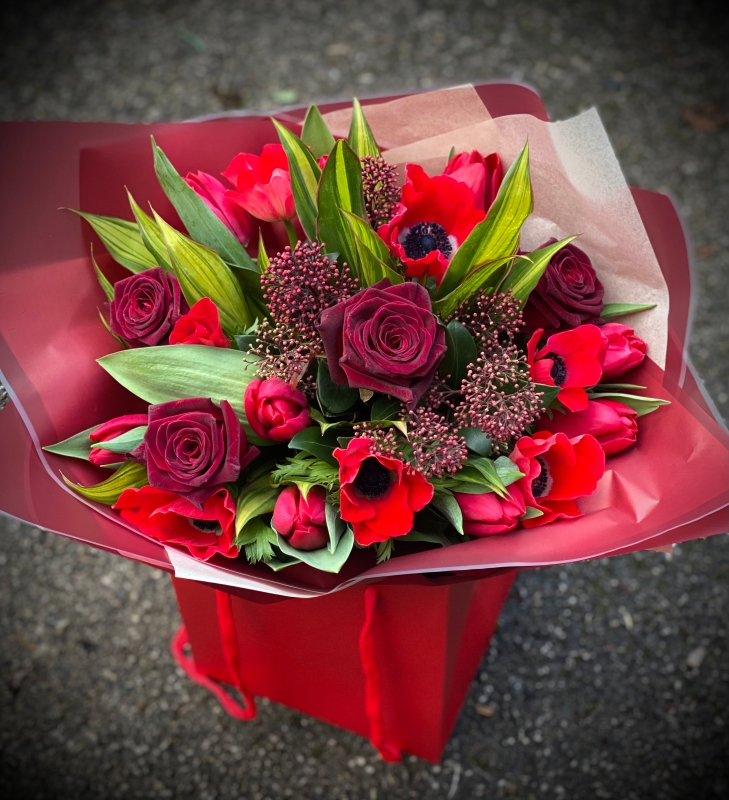 A Romantic Bouquet made using beautiful, red spring flowers including Anemones, Tulips, Red Roses and Skimmia and presented in a gift bag