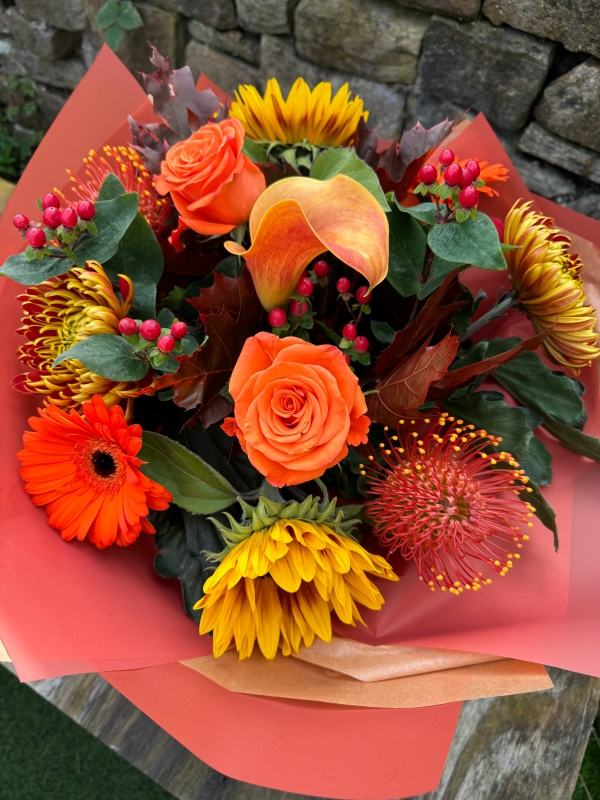 A beautiful, seasonal bouquet consisting of Sunflowers, Roses, Calla Lillies, Nutans, Berries, Blooms and berries with seasonal foliages.
