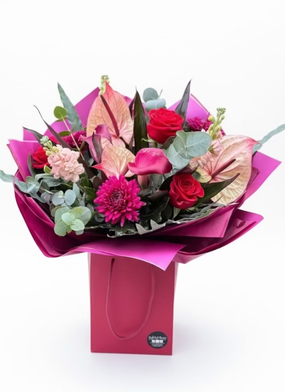A stunning bouquet consisting of Anthuriums, Red Roses, Stocks, Calla Lily, Blooms and fragrant Eucalyptus