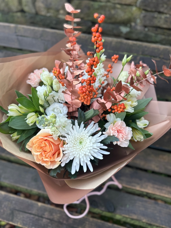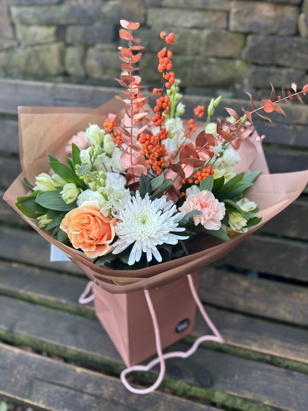 A Wintery bouquet in peaches and cream tones and presented in a bubble of water and gift bag.